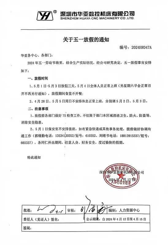 深圳市華亞數(shù)控機床有限公司關(guān)于五一放假的通知